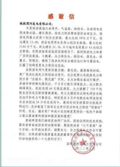 近期,國網陜西省電力有限公司給渭河發電發來了《感謝信》,感謝渭河發電在今年迎峰度夏期間保安全、保供電、保民生、保重點、保穩定,方面所做的貢獻。