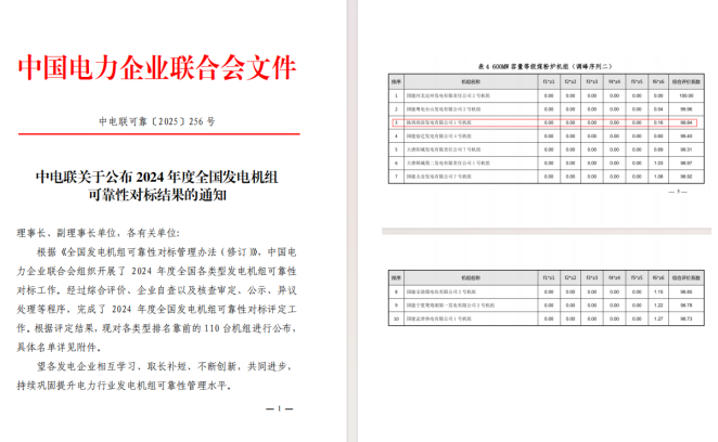 近日,中國電力企業聯合會公布了2024年度全國發電機組可靠性對標結果,商洛發電一號機組以綜合評價系數99.84的優異成績,位列600MW等級煤粉爐機組全國第三名。